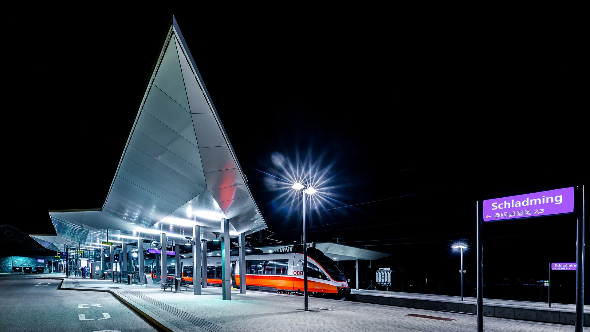 Entspannt von der Eisenbahn zur Seilbahn. Der Bahnhof liegt nahe dem Skizentrum in Schladming.