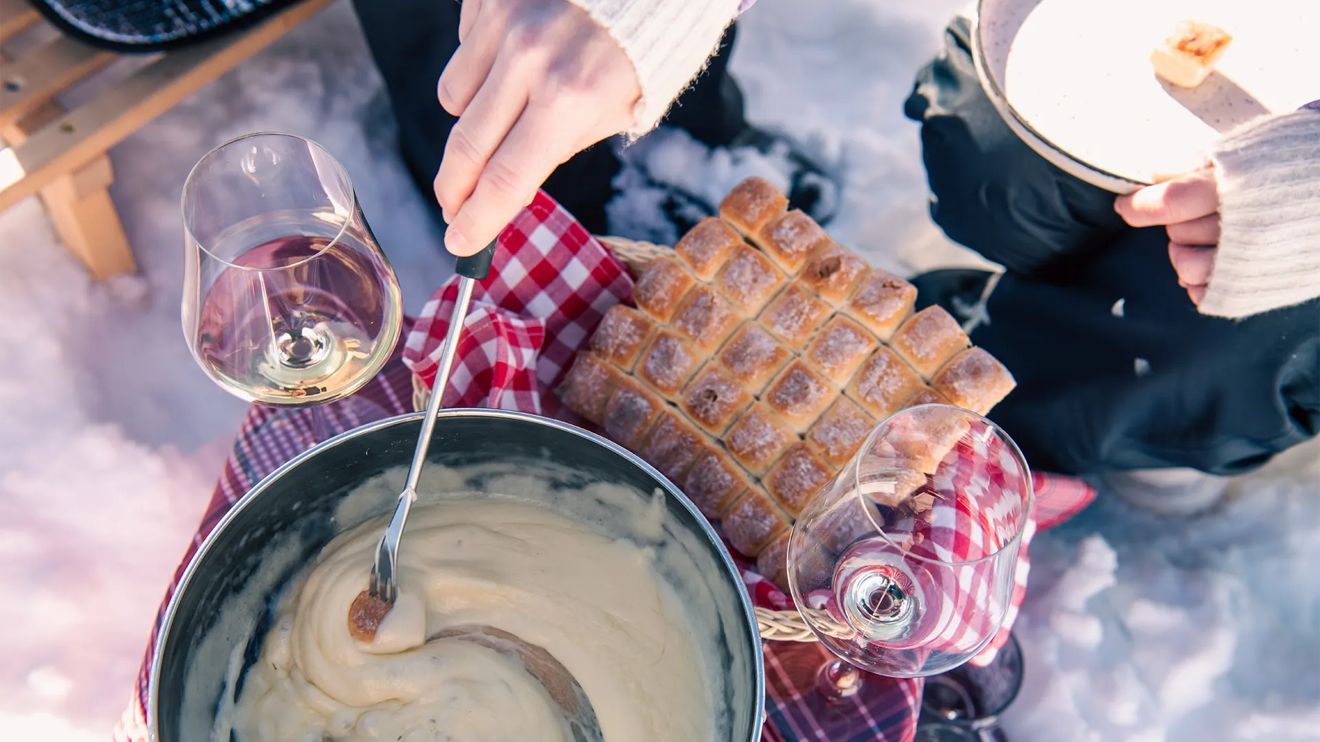 Wir stapfen los. Vor der Hütte zieht sich der Schlittelweg in moderaten Steigungen durch die grandiose Bergkulisse der Dreitausender Titlis, Spannort und Schlossberg. Eine Aussichtsbank wird unser Picknickplatz. Schnell ist die Holzkiste zum Tisch umfunktioniert. Der Gaskocher erhitzt die Fondue-Mischung aus der Engelberger Klosterkäserei. Ständiges Rühren ist angesagt. Inzwischen haben sich auch andere Spaziergänger auf den Weg gemacht und wünschen uns „En Guete mitenand“.